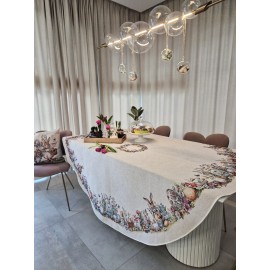 Głównym motywem tego wyjątkowego obrusa są małe żółte kurczaczki, które nadają całości uroku i słodyczy. Kwiaty w delikatnych odcieniach oraz subtelne motylki dopełniają kompozycję, tworząc harmonijną i radosną całość. Jasne tło podkreśla kolorystykę motywów, tworząc efektowny i przyjemny dla oka wzór.Wykonany z tkaniny hiszpańskiej żakardu gobelin..