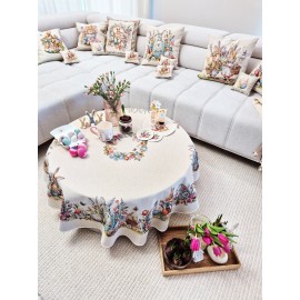 Okrągły Obrus Gobelinowy Ø140 cm z Wielkanocnym Motywem – Zajączki, Kwiaty i Pisanki Wprowadź świąteczny nastrój do swojego domu z okrągłym obrusem gobelinowym o średnicy 140 cm. Jego wyjątkowy wielkanocny wzór, pastelowe barwy i bogate zdobienia nadadzą Twojemu wnętrzu świeży, wiosenny charakter. Obrus zdobią zajączki w otoczeniu kwiatów..